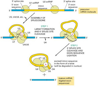 As sequências presentes na molécula de hnRNA que não possuem informação a ser utilizada na síntese das proteinas é removida a partir da atividade dos snRNAs, os RNAs pequenos nucleares. Estes RNAs atuam associados a proteínas, contituindo ribonucleoproteínas (RNPs - snRNPs). Segundo a regra GT/AG, para que o processo ocorra algumas regiões do intron devem ser identificadas: o dinucleotídeo GU na extremidade 5' do intron; o dinucleotídeo AG na extremidade 3' do intron e uma sequência polipirimidínica adjacente ao dinucleotídeo AG, na porção interna do intron.